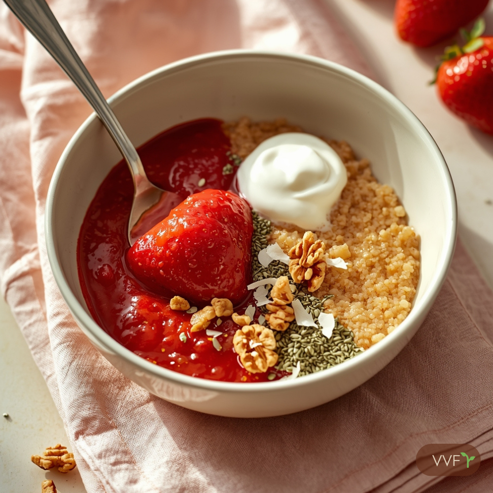 This is my go-to spring breakfast when strawberries come back into season β or when frozen ones are the only thing in the freezer and I want something that feels celebratory anyway. Quinoa cooked until fluffy, cashew butter and vanilla stirred in while the grains are still warm so the butter melts completely into the base. Strawberry compote simmered quickly with agave until bright and syrupy. Cold soy yogurt on top for the temperature contrast that makes this feel like a layered dessert rather than a breakfast bowl.