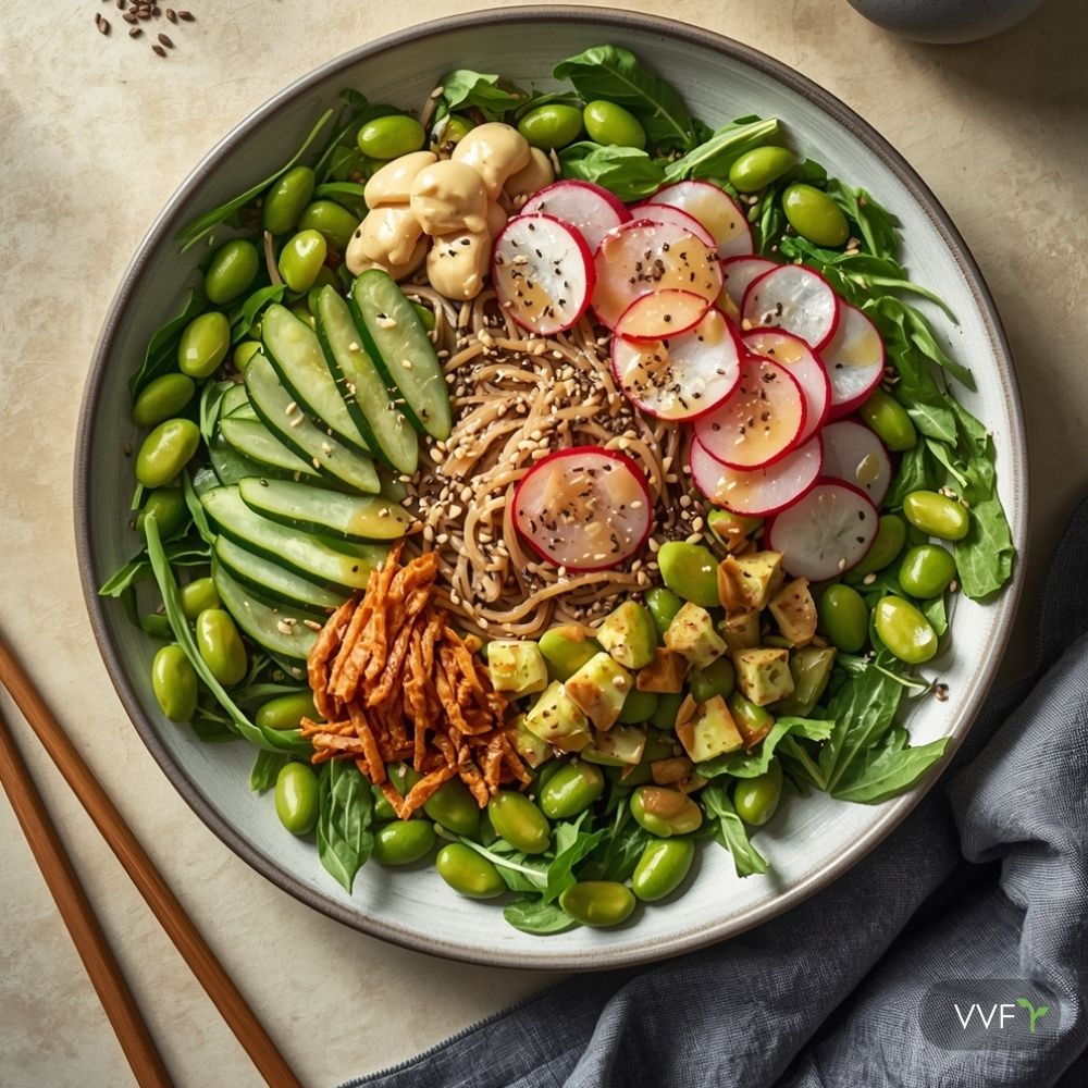 This is the bowl I make when I want something that feels effortless and clean but delivers serious nutrition. Buckwheat soba cooked and immediately rinsed in cold water until the noodles are springy, separate, and completely non-gummy β the cold rinse is the one technique that separates good soba from a starchy clump. Edamame cooked in the same pot in the final 3 minutes. Everything chilled together, tossed with a sesame-miso dressing that is nutty, tangy, and deeply umami, then layered over arugula with cucumber matchsticks, radish coins, and pickled ginger on top.